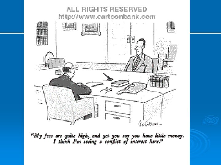 Interest in Conflict of Interest Industry has dramatically increased its funding of clinical research compared to the government • Phase I-III Trials: -Pharmaceuticals $20 billion -NIH $ 6 billion 62% 32%
