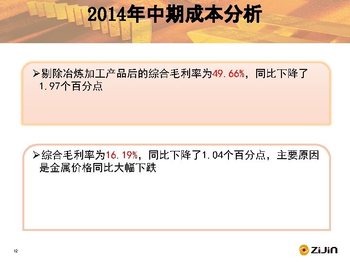 ���� Financial Highlight 2014年中期毛利率 Disclaimer 2014 H 1 Gross Margin 产品 Product 2013/6/30(%) 37. 69 48. 06 -10. 37 0. 55 -1. 13 1. 68 矿产金 Mined Gold 加 金 Gold 矿产银 Mined Silver 35. 79 52. 96 -17. 17 矿产铜 Mined Copper 52. 02 55. 78 -3. 76 冶炼铜 Copper -0. 78 -3. 92 3. 14 矿产锌 Mined Zinc 56. 89 55. 52 1. 37 冶炼锌 Zinc 0. 68 2. 46 -1. 78 铁精矿 Iron Ore 63. 83 66. 06 -2. 23 综合 Total 16. 19 17. 23 -1. 04 49. 66 51. 63 -1. 97 综合(不含冶炼加 产品) 10 2014/6/30(%) 上升/下降百 分点 % Points Total (Excluding Refined Products)