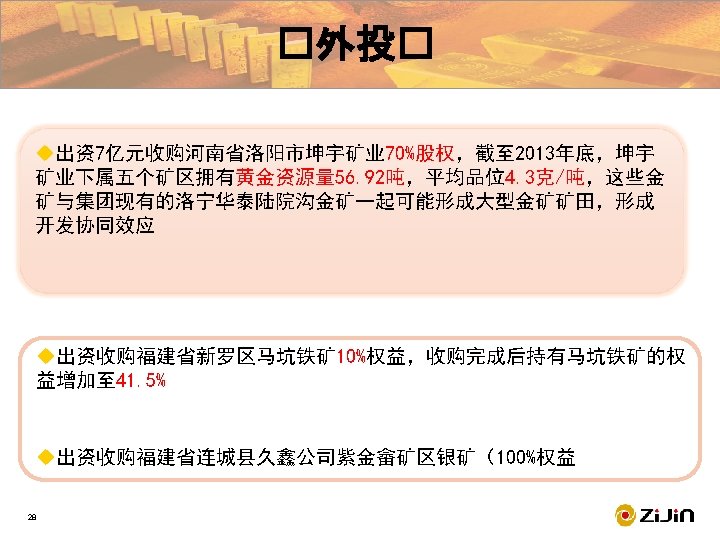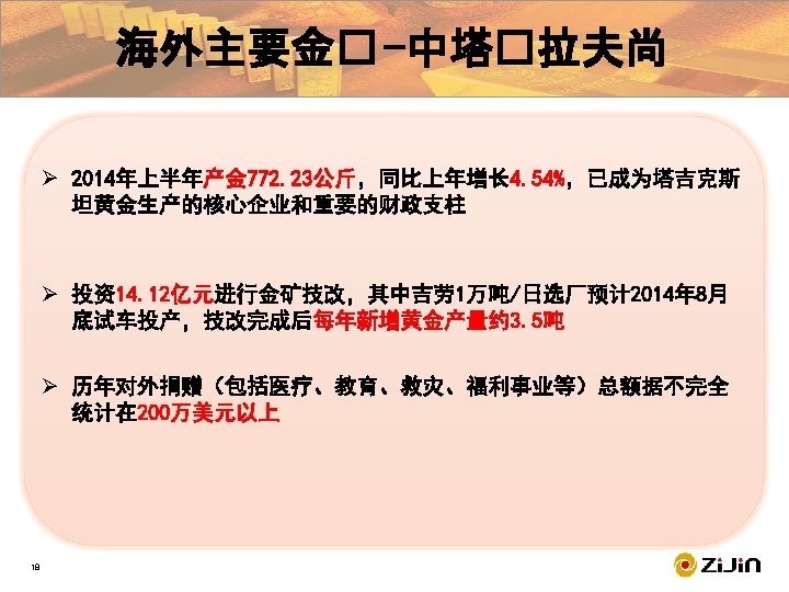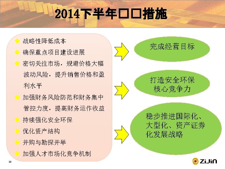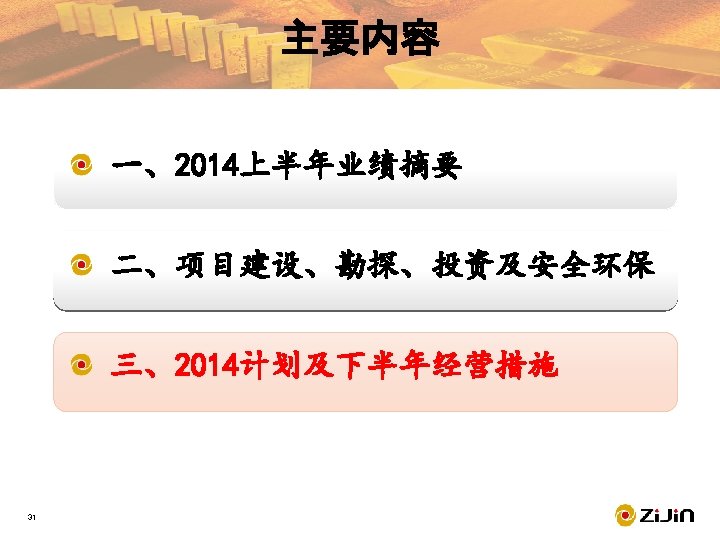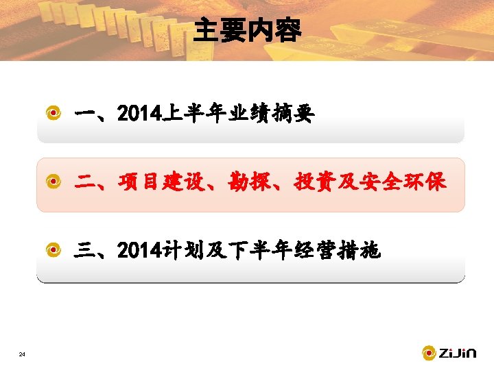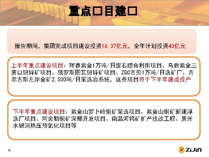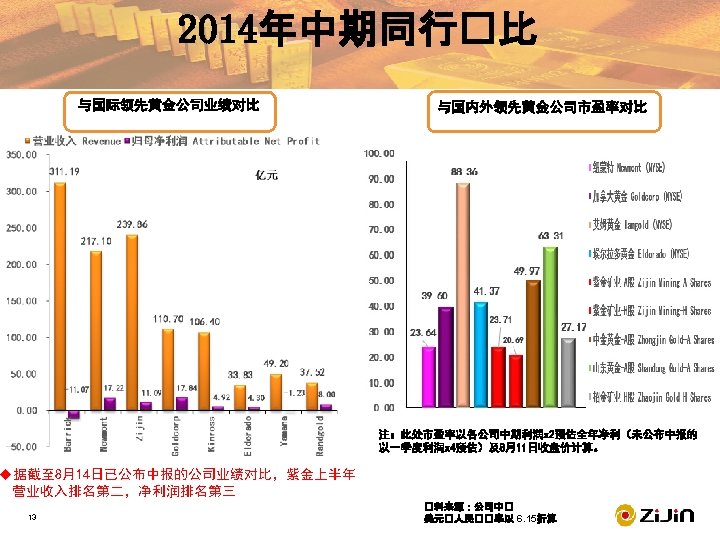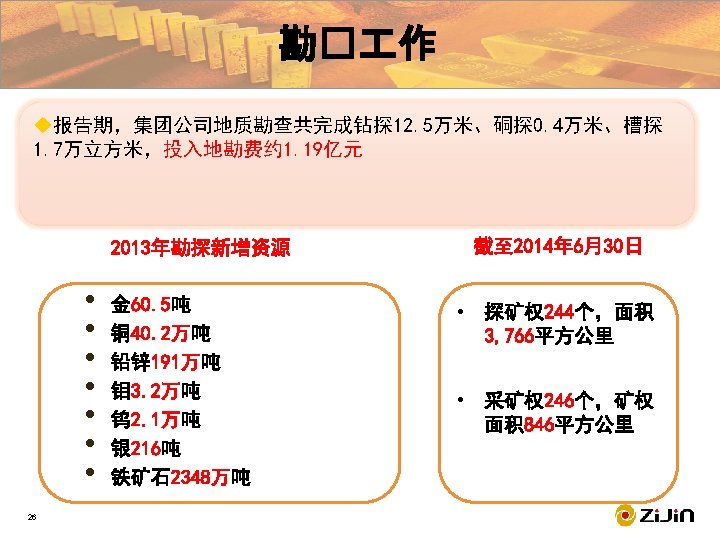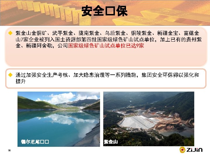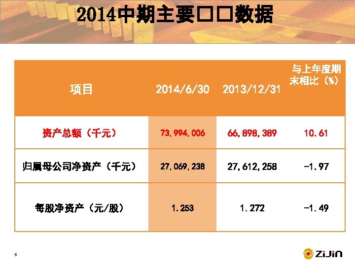 ���� Financial Highlight 其他主要企� Disclaimer 2014 H 1 2013 H 1 同比(%) YOY 冶炼锌(吨) 92, 823 80, 527 15. 3 净利润(万元) -6, 566 -4, 208 -56. 04 2014 H 1 2013 H 1 同比(%) YOY 锌产量(吨) 21, 088 17, 179 22. 8 净利润(万元) 6, 063 10, 507 -42. 3 巴彦淖尔锌冶炼 乌拉特后旗紫金 23
