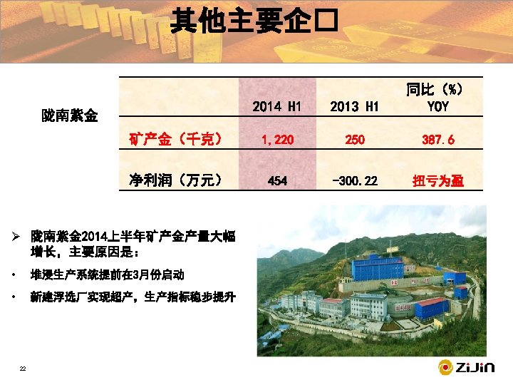 ���� Financial Highlight 其他主要企� Disclaimer 2014 H 1 2013 H 1 同比(%) YOY 冶炼铜(吨) 107, 000 93, 440 14. 5 银产量(千克) 46, 169 58, 233 -20. 7 净利润(万元) -6, 982 -26, 093 -73. 2 紫金铜业 21