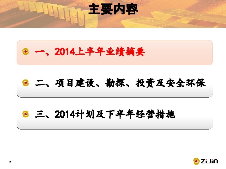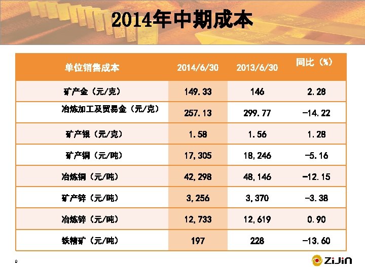���� Financial Highlight 2014年中期�量 Disclaimer 项目 同比(%) 2014/6/30 2013/6/30 黄金产量(千克) 59, 656 55, 664 7. 17 其中:矿产金(千克) 15, 612 14, 724 6. 03 44, 044 40, 940 7. 58 铜产量(吨) 181, 321 158, 843 14. 15 其中:矿产铜(吨) 70, 437 61, 695 14. 17 冶炼铜(吨) 110, 884 97, 149 14. 14 139, 263 46, 440 117, 354 36, 827 18. 67 26. 10 92, 823 80, 527 15. 27 5, 099 4, 350 17. 22 134, 822 146, 590 -8. 03 124. 51 97. 88 27. 21 冶炼加 贸易金(千克) 锌产量(吨)Zinc (t) 其中:矿产锌(吨) 冶炼锌(吨) 铅产量(吨) 银(千克) 8 铁精矿(万吨)