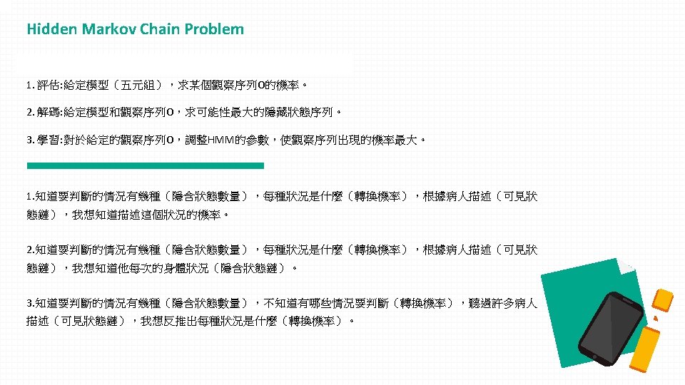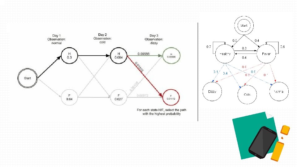 Hidden Markov Chain Example 初始狀態: Health: 0. 6 Fever: 0. 4 我們可能得到這麼一串結果:Normal Cold Dizzy 這串結果叫做可見狀態鏈。 隱含狀態鏈有可能是: Health Fever