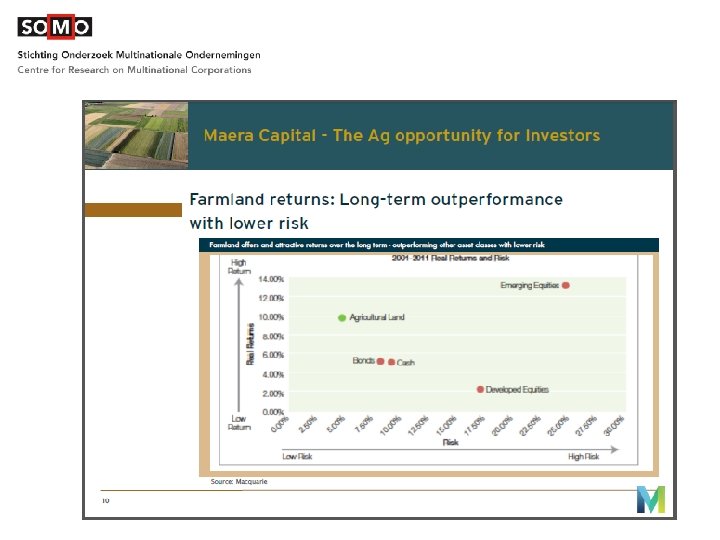 What strategies ? n Advertised as providing high returns (10%, even up to 35% vs. investment climate of low returns): marketing ! n High amounts of capital invested to buy or lease land n Profits : – not only from production – also from increase in land value n New investment strategy: ensure good production by investing in farms & land of good farmers who get a part of the profits