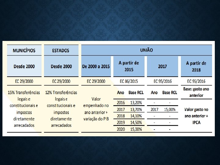 EMENDA CONSTITUCIONAL 86/2015 Art. 198 da CF 1988: § 2º A União, os Estados, o Distrito Federal e os Municípios aplicarão, anualmente, em ações e serviços públicos de saúde recursos mínimos derivados da aplicação de percentuais calculados sobre: (Incluído pela Emenda Constitucional nº 29, de 2000) I - No caso da União, a receita corrente líquida do respectivo exercício financeiro, não podendo ser inferior a 15% (quinze por cento); (Redação dada pela Emenda Constitucional nº 86, de 2015)