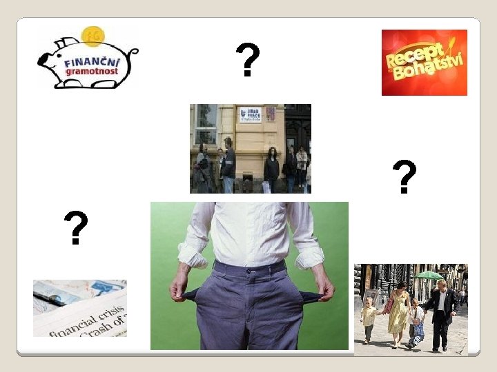 Finanční gramotnost je soubor znalostí, dovedností a hodnotových postojů občana nezbytných k tomu, aby finančně zabezpečil sebe a svou rodinu v současné společnosti a aktivně vystupoval na trhu finančních produktů a služeb. Finančně gramotný občan se orientuje v problematice peněz a cen a je schopen odpovědně spravovat osobní/rodinný rozpočet, včetně správy finančních aktiv a finančních závazků s ohledem na měnící se životní situace Domácí měsíční rozpočet (průběžně sledovat a upravovat) Plánovat výdaje do budoucna, priority ve vydávání financí, finanční plánování Plánovat proto, abychom se připravili na zlé časy (např. ztrátu zaměstnání, nemoc) + Příjmy ? Úspory ? ? Rezervy ? Výdaje -