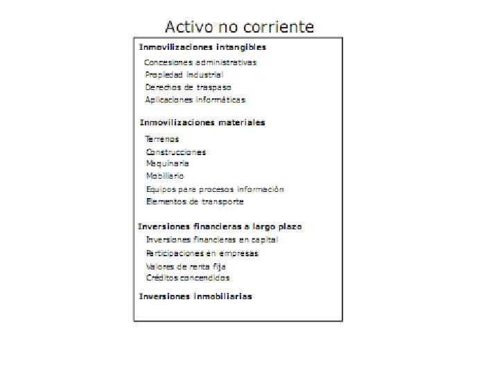 Activo no corriente • Activos destinados a servir de forma duradera en las actividades de la empresa. • Soportan el proceso productivo y no están destinados a ser vendidos, consumidos o realizados en el ciclo normal de explotación (normalmente este ciclo es de un año).