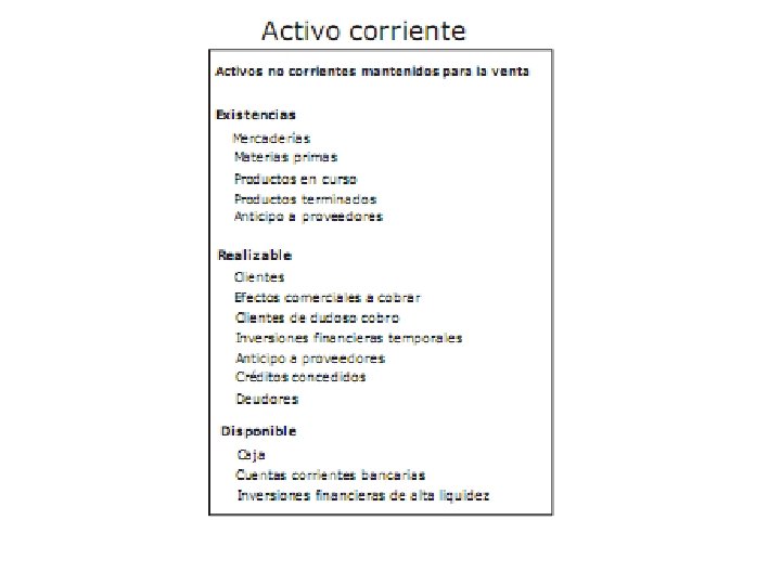 Activo corriente • Es el activo de carácter circulante. • Activos destinados a ser vendidos, liquidados o consumidos (incorporados al proceso productivo) en el ciclo normal de explotación (menos de un año). • Por sus características se transformarán en liquidez en menos de un año.