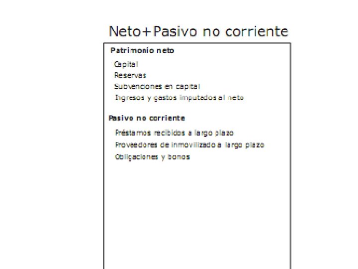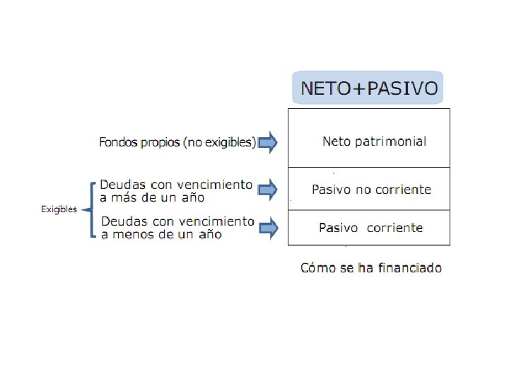 Distinguimos: • 1. El neto: parte financiera no exigible. • 2. Pasivo no corriente: exigible a largo plazo. • 3. Pasivo corriente: exigible a corto plazo.