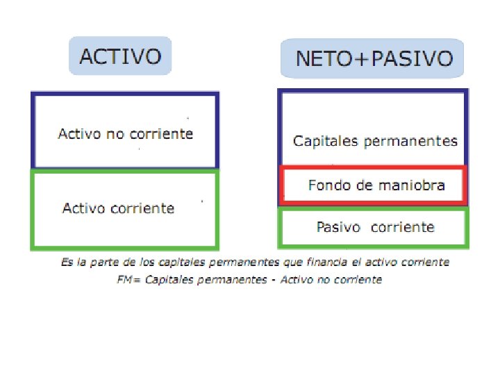 Fondo de maniobra • Es la parte del activo corriente financiada con capitales permanentes. FM = AC – PC