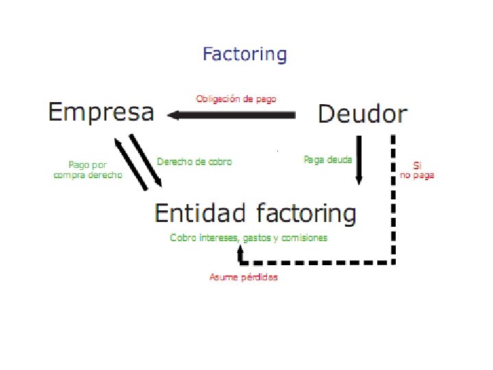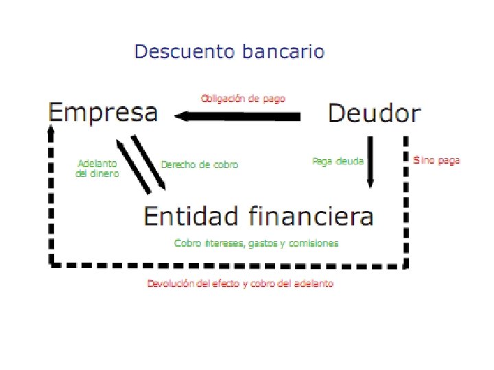 La financiación a corto plazo • Descuento bancario • Abono anticipado de un derecho de cobro. La entidad financiera adelanta el pago, pero descuenta del total intereses, gastos y comisiones. • En caso de que llegado el momento el deudor no pague, la entidad financiera reclama la devolución del abono adelantado más gastos y comisiones.