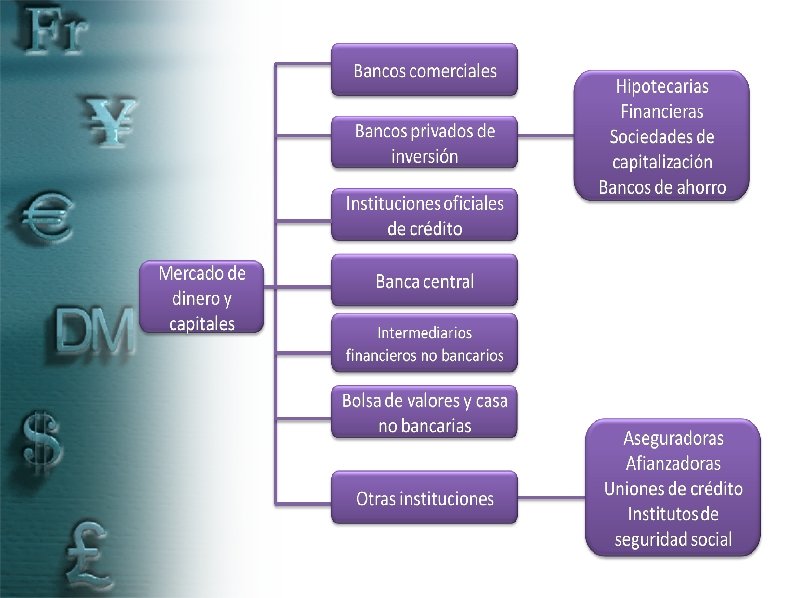 Mercado de dinero Conocido también como mercado monetario, en él se ofrecen y demandan instrumentos financieros con las siguientes características: Son de corto plazo Son de bajo riesgo Tienen un alto grado de liquidez