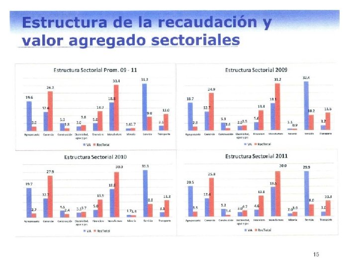 Principales características de la recaudación (Con base en la propuesta de reforma tributaria presentada por el GRUN) Tres sectores económicos concentran el 70% de la recaudación interna: industria, comercio y financiero. No existe correspondencia entre la importancia del sector en la economía con respecto a su carga impositiva.