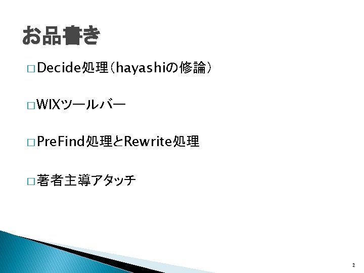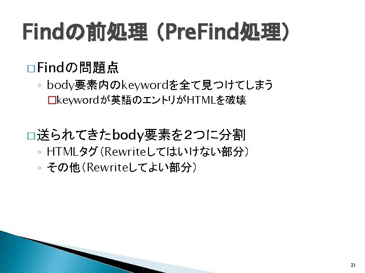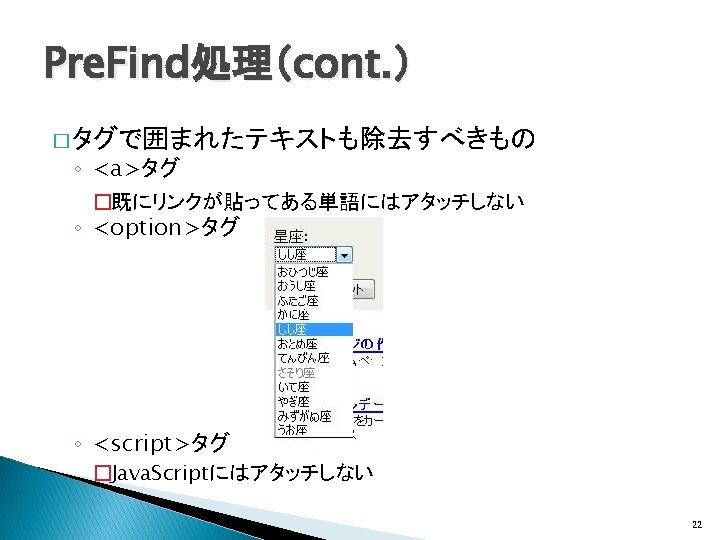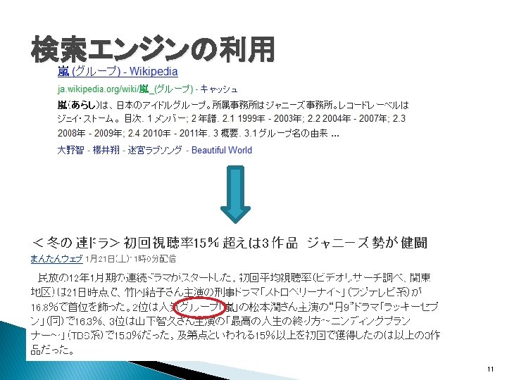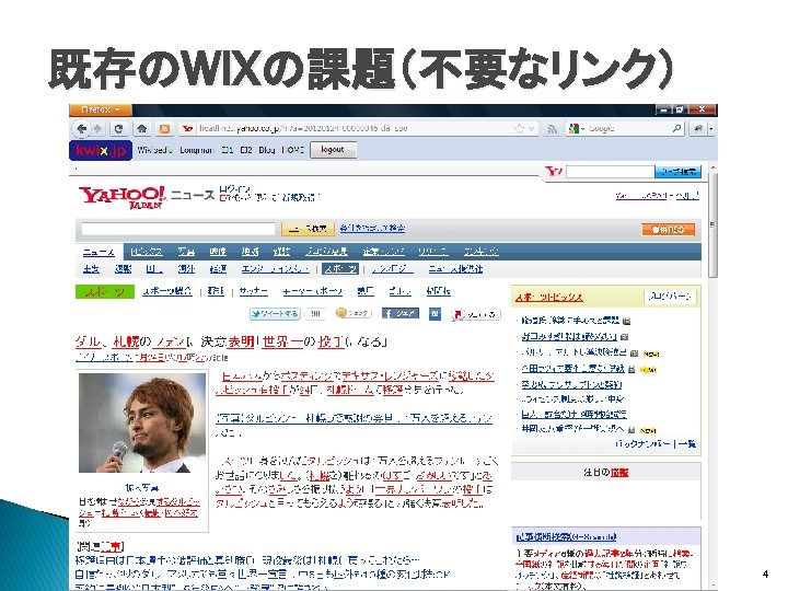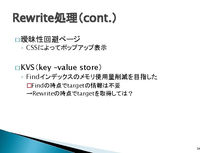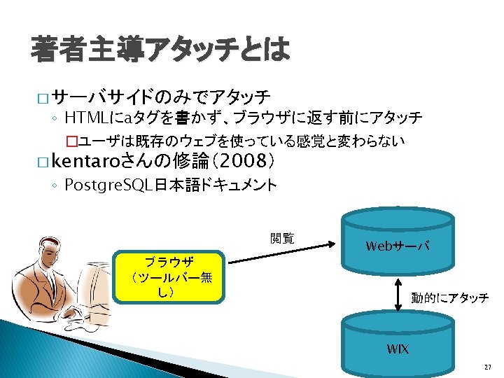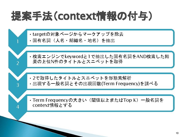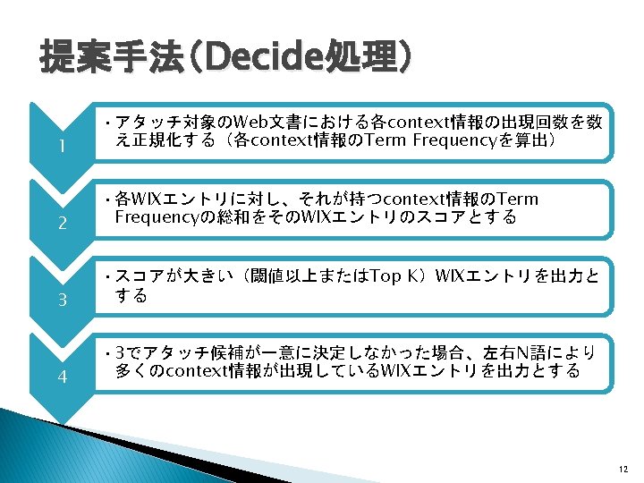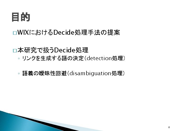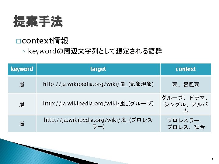 関連研究(Wikificationシステム) � Wikipedia記事へのリンクをWeb文書に生成 ◦ Wikify!: linking documents to encyclopedic knowledge �Rada Mihalcea, Andras Csomai, CIKM, 2007 ◦ Learning to link with Wikipedia �David Milne, Ian H. Witten, CIKM, 2008 Wikipediaの内部リンク構造を利用 全Web文書をtargetの対象とするWIXには適さな い 7