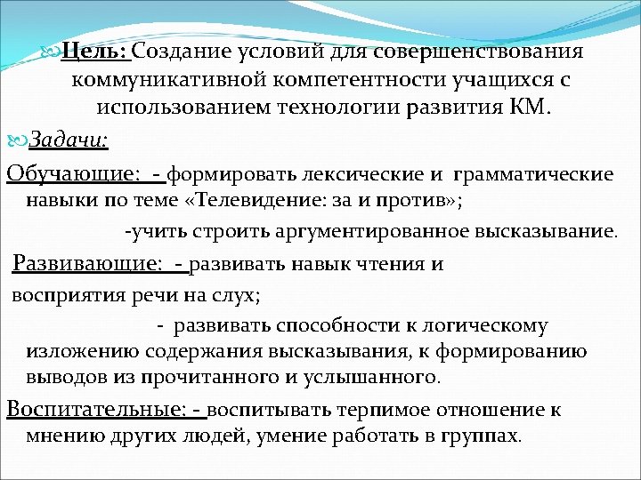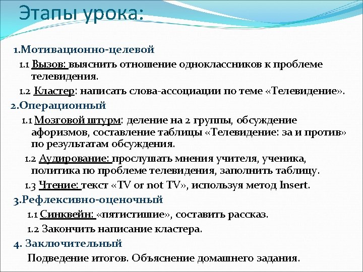 Таблицы: “TV: Prons and cons”. /пример/ TV cons. 1. TV makes the viewer completely passive. TV Prons. 1. TV may be a good company to those who have different problems in life and they look for calmness, zest of life in TV soaps, which help overcome their difficulties. 2. TV is convenient source of entertainment for those who want to relax from hectic, rhythm of life. 3. TV provides enormous possibilities for education like school programmes. 2. TV prevents people from communicating with each other. 3. People have grown addicted to TV, often neglecting the necessary and more important things.