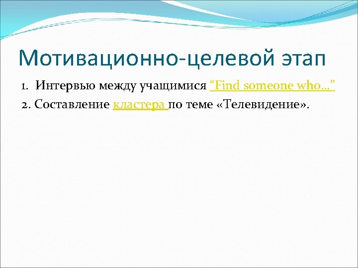 Дополнение кластера A good company Educational Discovery Children’s For Kids Making lazy + - Programmes MTV Music Musiс box Sport Prons&Cons Russia today News Types of TV TV BBC Interactive On-line Role of TV connecting informative entertaining domestic