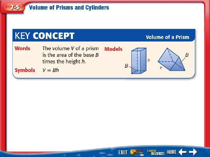 Find the Volumes of Prisms Find the volume of the triangular prism. Volume of a prism The base is a triangle, so B = The height of the prism is 4. Simplify. Answer: The volume is 270 cubic feet.