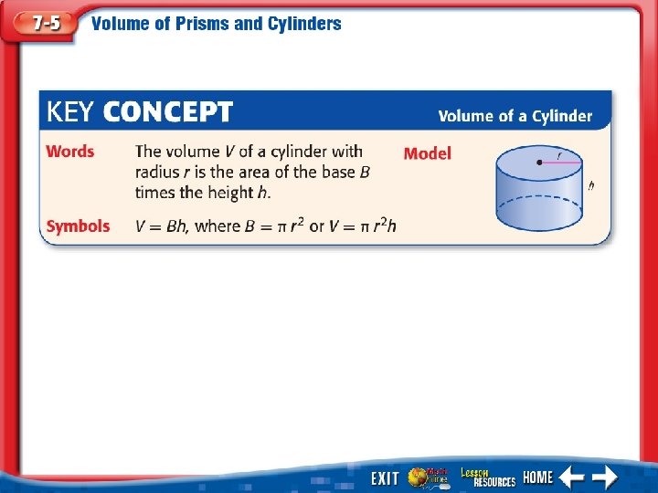 Find the Volume of a Cylinder Find the volume of the cylinder. Round to the nearest tenth. Volume of a cylinder Replace r with 3 and h with 12. V ≈ 339. 3 Simplify. Answer: The volume is about 339. 3 cubic centimeters.