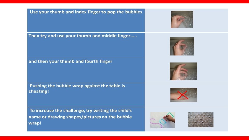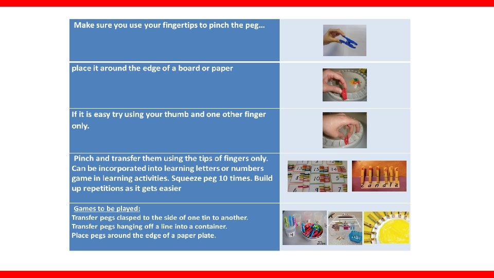 PREPARATORY ACTIVITIES- Finger Strengthening First try to find the pegs in the putty using your fingertips Then roll the putty into a sausage. Make a caterpillar by pinching it between your thumb and index finger…. Try using your thumb and middle finger Now using one hand only scrunch the caterpillar up… Still using one hand only…squash it into a pancake and then make it into a ball inside your hand! .
