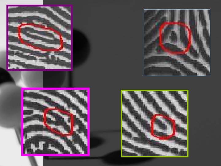 Ridge Characteristics Minutiae—characteristics of ridge patterns § § § § § Ridge ending Short ridge Dot or fragment Bifurcation Double bifurcation Trifurcation Bridge Island Enclosure Spur