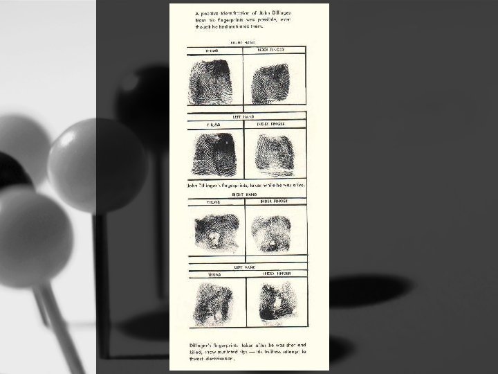 What was used before f’prints? • Alphonse Bertillion (1883) – – French policeman Detailed description of the suspect Anthropometry 11 measurements • • • Height Expanse of his arms Circumference of his head (using calipers) Length of right ear Length of left foot Length of selected fingers Size and shape of nose Tilt of forehead Scars and blemishes – The possibility that 2 people would have the same measurements was 1 in 4 million • Ex: Will West (1903 – Leavenworth prison)