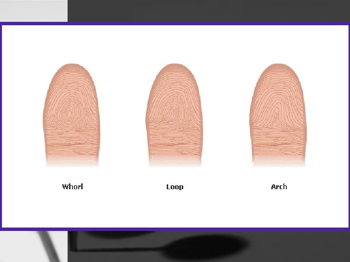 Three Principles (cont. ) • 2 nd – A fingerprint will remain unchanged during an individual’s lifetime – Epidermis and Dermis – Fingerprints are a reproduction of skin ridges (used for friction/firmer grasps) – Dermal papillae – boundary between the dermis/epidermis • Determine the form and pattern of the ridges on the surface of the skin • Develop in the fetus