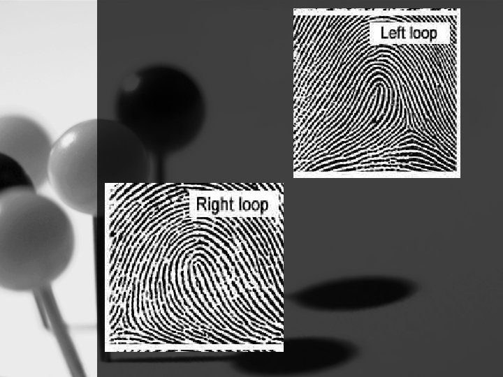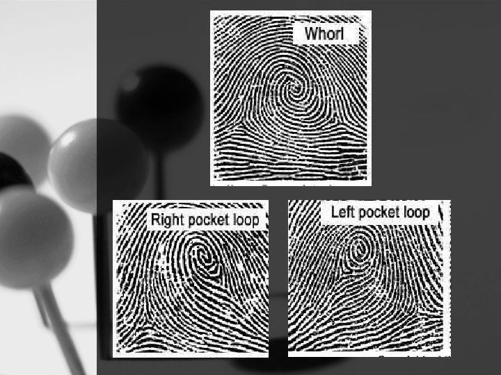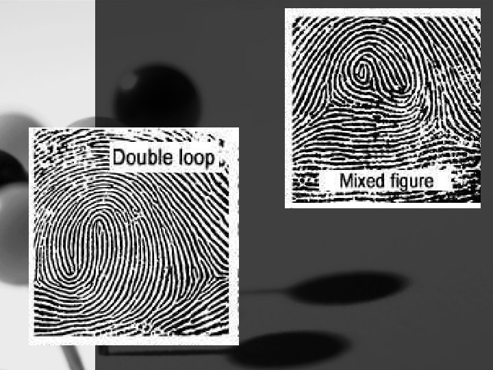 Three Principles (cont. ) • Whorls (cont. ) – Double loop – 2 loops combined into one fingerprint – Accidental – • contains 2 or more patterns (not including the plain arch) • Pattern not covered by other categories