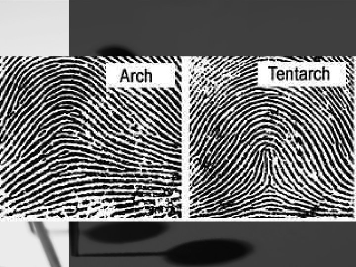 Three Classes (cont. ) • Arch (5%) – ridge lines that enter the print from one side and flow out the other side – Do not have type lines, deltas or cores – Least common – Plain arch – simplest of all • See definition above • Form a wavelike pattern – Tented arch • Instead of rising smoothly at the center there's a sharp spike or the ridges meet at an angle that is less than 90 degrees