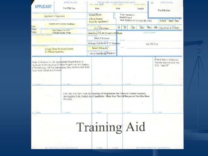 Inked prints n n n Rolled and simultaneous impressions Thumbs go toward the body Fingers go away from the body Card must be signed by person being printed Good inked prints are crucial to the fingerprint examiner & AFIS database Fully rolled from nail to nail and to the joint break