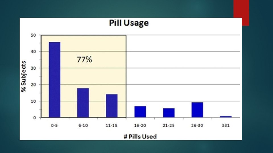 45% took 5 pills or less Some took none Total unused pills: 4, 639 79% were leftover California: 3, 039 orthopedic surgeons 3, 382, 407 unused pills