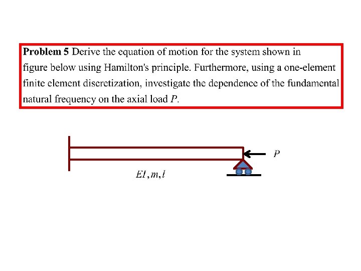Problem 19. Investigate the influence of load P on the first two natural frequencies of the Euler-Bernoulli beam shown below. 22