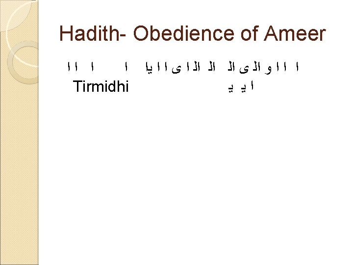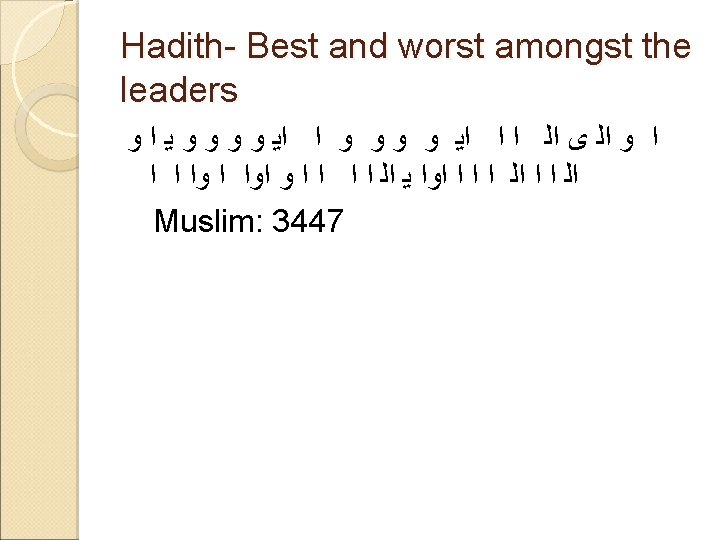 Leadership in Hadith ﺍﺍ ﺍ ﻭ ﺍ ﻱ ﺍ ﺍ ﻭ ﻱ ﺍ ﺍﻟ ﻭ ﺍ ﺍﺍ ﻭ ﺍ ﻭ ﺍﻟ ﻯ ﺍﻟ ﻭ ﻭ ﺍﻟ ﻭ ﺍ ﻭ ﻳ ﺍ ﻱ ﺍ ﺍﻟ ﺍ ﺍ ﻭ ﺍ ﻱ ﺍ “Behold! Everyone of you is a leader and you shall be asked about those you lead. Imam is a leader over the people and shall be asked about them; a man is a leader of the house and shall be asked about his household ; a woman is a leader over her children and she shall be asked about them. ” (Reported Abdullah Ibn Omar in Bukhari and Muslim ).