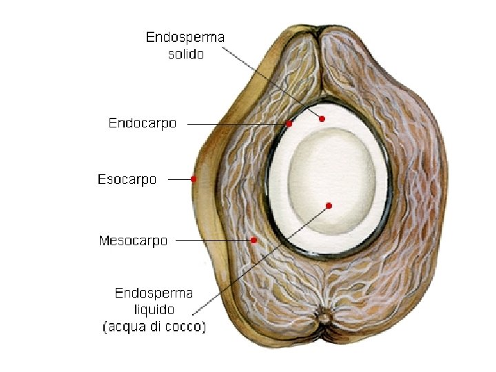 Frutti carnosi: si dicono "drupe" i frutti che hanno il seme (a) o la mandorla (b) inserito nell'endocarpo (o nocciolo). Quest'ultimo è immerso nella polpa (mesocarpo). La buccia che avvolge il frutto viene detta epicarpo. (c): talora l'endocarpo o nocciolo può avere spessore notevole (es. : pesca) (d): a volte l'involucro del nocciolo può essere coriaceo e non duro (es. : mela) (e): si dicono "bacche" i frutti che hanno i semi immersi direttamente nella polpa (es. : uva)