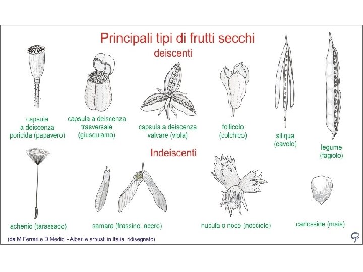 Frutti semplici Originati dallo sviluppo dell’ovario di un solo fiore che ha il gineceo monocarpellare (con un solo carpello) o sincarpico cioè con più carpelli saldati tra loro, concresciuti che non si separano a maturità e la parete esterna del frutto (pericarpo) derivano soltanto dalla parete dell’ovario. Deiscenti Follicolo, Legume, Capsula, Siliqia, Siliquetta Frutti secchi Indeiscenti Achenio, Cariosside, Legume indeiscente, Utricolo o Tricello