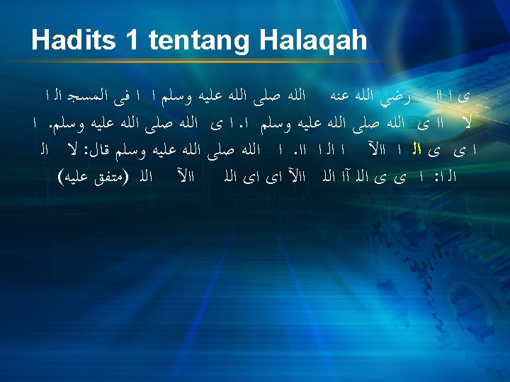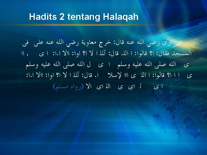 Dari Abi Said al-Khudriy ra, dia berkata: “Muawiyah keluar menuju HALAQAH (lingkaran orang) yang ada di dalam masjid, lalu ia bertanya, ‘Apa yang menjadikan kalian duduk-duduk di masjid? ’ Mereka menjawab, ‘Kami duduk mengingat Allah. ’ Ia bertanya, ‘Demi Allah, apakah hanya itu yang mengundang kalian duduk-duduk? ’ Mereka menjawab, ‘Tidak ada yang menarik kami untuk duduk-duduk melainkan hanya itu. ’ Lalu ia berkata, ‘Ketahuilah! Aku minta kalian bersumpah bukan karena aku tidak percaya pada kalian, dan tidak ada seorang pun menyamai kedudukanku di sisi Rasulullah SAW yang lebih sedikit menceritakan hadits beliau dari pada aku. Sesungguhnya Rasulullah SAW keluar kepada sekumpulan sahabatnya, lalu beliau bertanya, ‘Apa yang menjadikan kalian duduk-duduk di masjid? ’ Mereka menjawab, ‘Kami duduk-duduk mengingat Allah, memuji. Nya atas nikmat hidayah. Nya yang membawa kami kepada Islam dan memberikan Islam kepada kami. ’ Beliau bertanya, ‘Demi Allah, apakah hanya itu yang mengundang kalian duduk-duduk? ’ Mereka menjawab, ‘Tidak ada yang menarik kami untuk duduk melainkan hanya itu. ’ Lalu beliau berkata, ‘Ketahuilah! Aku minta kalian bersumpah bukan karena aku tidak percaya pada kalian, akan tetapi Jibril datang kepadaku dan memberitahukan kepadaku bahwa Allah membanggakan kalian di hadapan para malaikat. ’ (HR. Muslim, diambil dari Riyadhush-Shalihin no. 1458