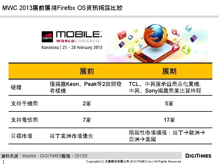 Firefox OS支持的電信商自 7家增至 17家 # 電信商 國家 首波支持 附註 1 América Móvil 墨西哥 2 China Unicom 大陸 3 Deutsche Telekom 德國 V 4 Etisalat 阿聯酋 V 5 Hutchison Three Group 香港 6 KDDI 日本 7 KT 南韓 南韓最大電信商 8 Mega. Fon 俄羅斯 9 Qtel 卡達 10 Sing. Tel 新加坡 11 Smart 菲律賓 V 12 Sprint 美國 V 13 Telecom Italia Group 義大利 V 14 Telefónica 西班牙 V 15 Telenor 挪威 V 16 Vimpelcom 葡萄牙最大、俄羅斯第二大電信商 17 Telstra 澳大利亞 資料來源:Mozilla公司、DIGITIMES整理,2013/2 3 Copyright (C) 大椽股份有限公司 (DIGITIMES Inc. ) All Rights Reserved.