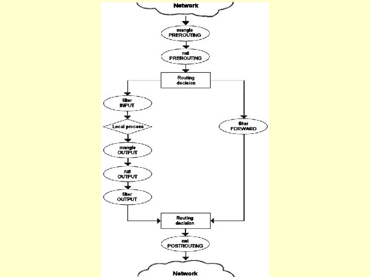 Significado (cont. ) • Local process: Um pacote que roda em uma máquina pode receber pacotes após o roteamento e pode enviar pacotes [que passará pelo do processo de roteamento e irá através da output chain]