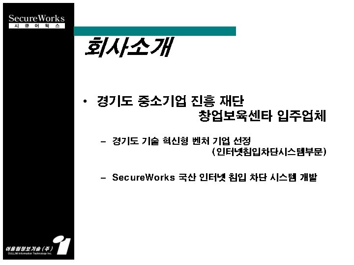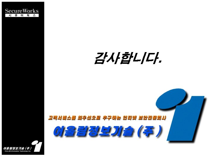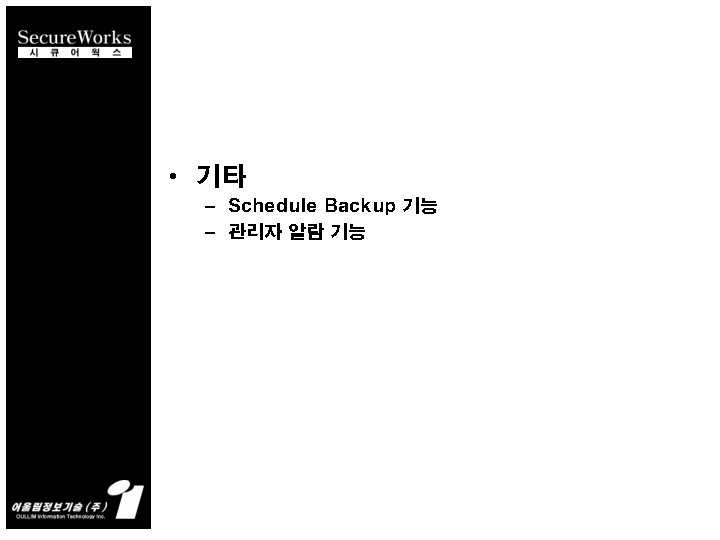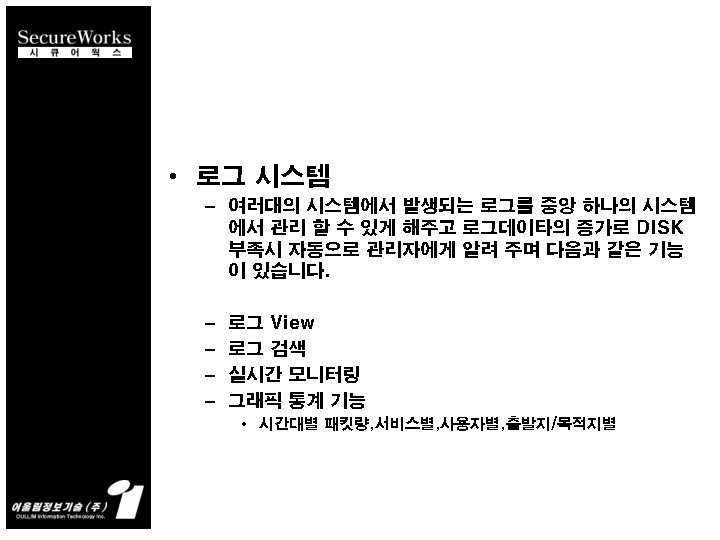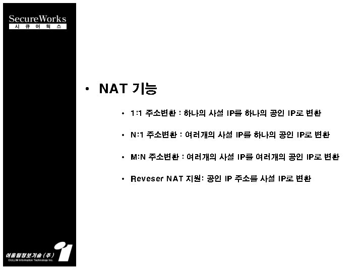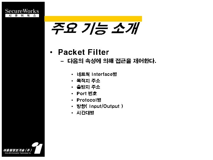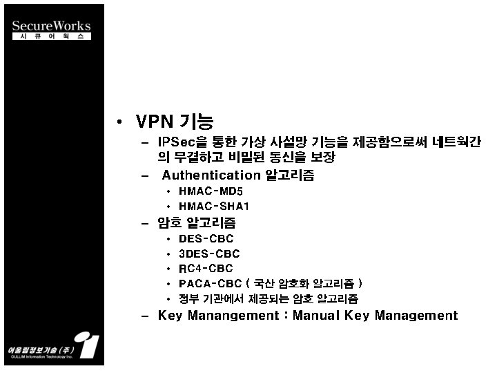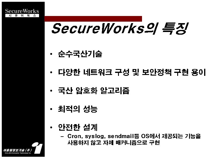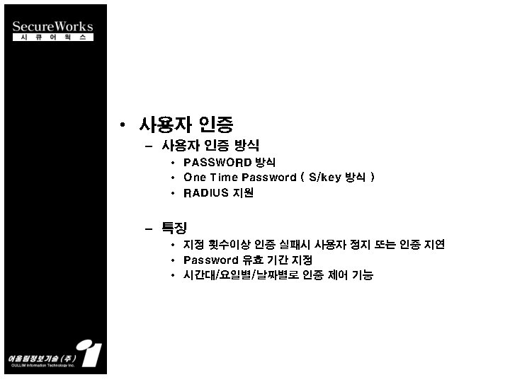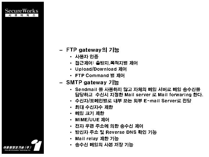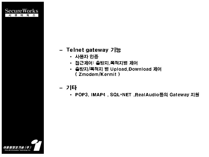 Secure. Works • 관리자 환경(Administration Environment) – Web Browser에서 128 bit SSL 사용하여 방화벽 제어 모듈과 통신 • One-Time-Password / 일반 Password 방식 지원 • 방화벽 Type – Hybrid 방화벽 ( Packet Filter + Application Gateway ) – Dual-Homed Gateway 방식
