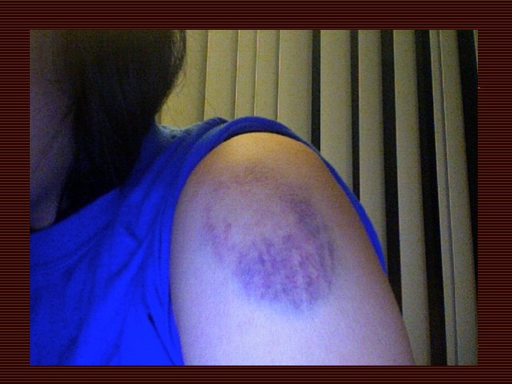 CLOSED WOUNDS o BRUISES n Develops when the body is bumped or hit. n Force of the blow damages the soft tissue layers beneath the skin, causing internal bleeding. n Blood and other fluids seep into the surrounding tissues, causing the area to change color and swell.