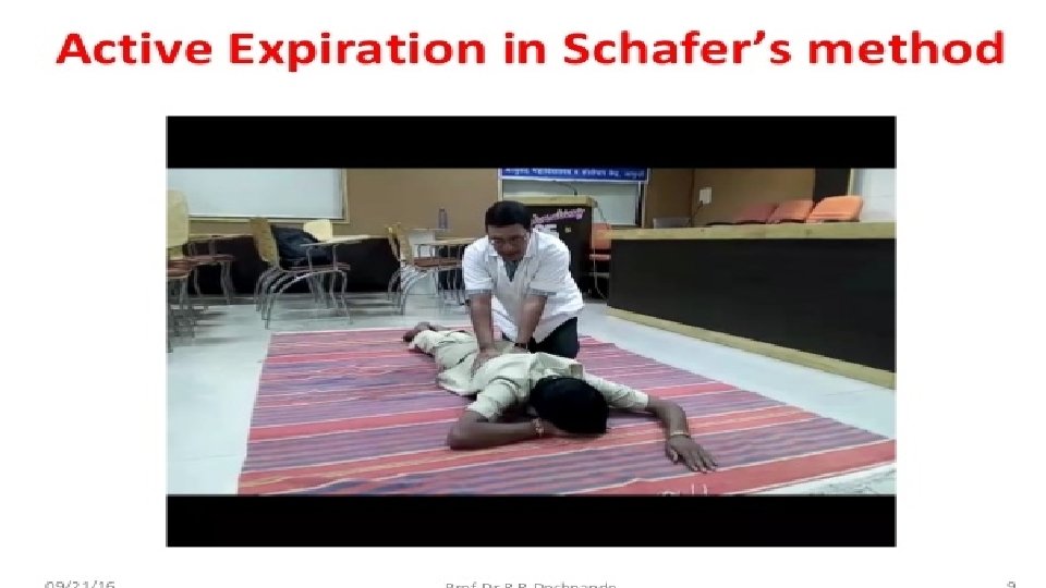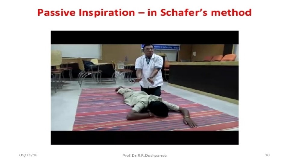 Schafer's method is the simplest method of artificial respiration. It can be performed without assistance and encourages the removal of fluid from the air passages by gravity. 1 -The patient is placed on his face with his shoulders raised a little so that the mouth is unobstructed.