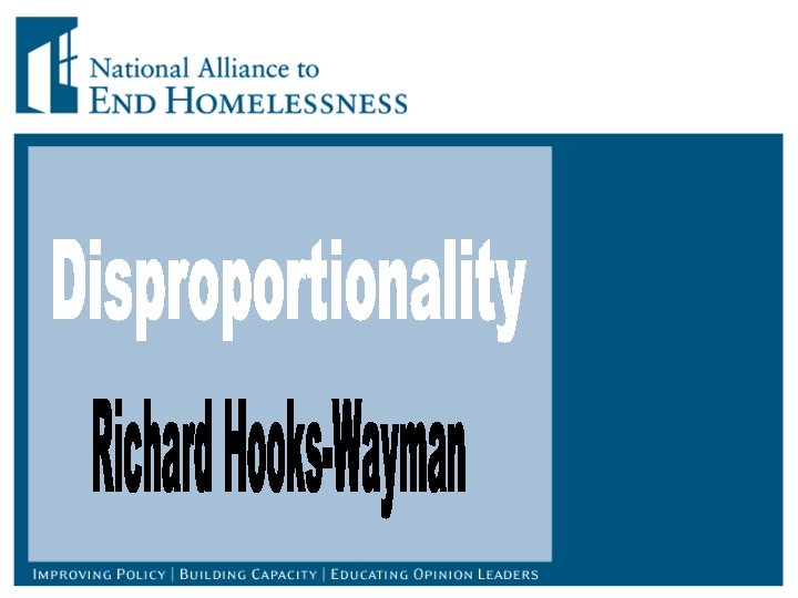 First Annual Homeless Assessment Report on Homeless Adults and Youth (HUD) • Disproportionate representation of individuals of color in homelessness compared to the general population. • Even when factoring-in poverty, there was a slight disproportionate representation for individuals of color.