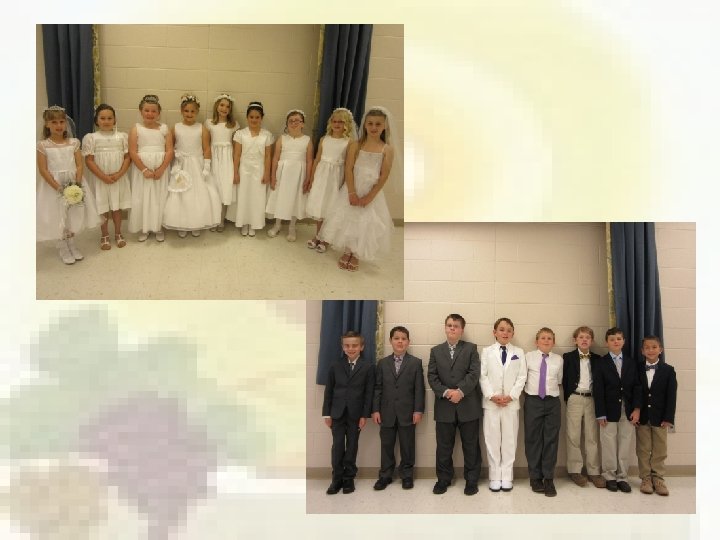 Schedule for First Communion: March 20, 2021 March 27, 2021 April 17, 2021 April 28 Parent/Child session 10: 00 -11: 30 AM Parent/Child session 10: 00 AM -12: 15 PM 6: 00 pm – Rehearsal & Pictures First Communion weekend is May 8/9, 2021 at all Masses.