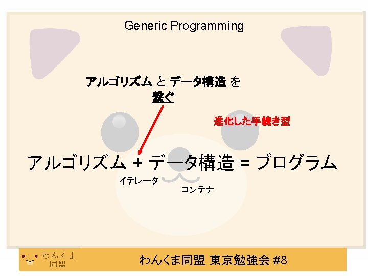 C# で Generic Programming IEnumerable<T> で、データ/コレクションにかかわらず列挙できる。 List<int> il; Linked. List<string> sll; char[] ca; foreach ( int item in il ) { … } foreach (string item in sll ) { … } それぞれの Ienumerable<T> foreach ( char item in ca ) { … } に対して • bool Move. Next() • T Current { get; } できるから。 わんくま同盟 東京勉強会 #8