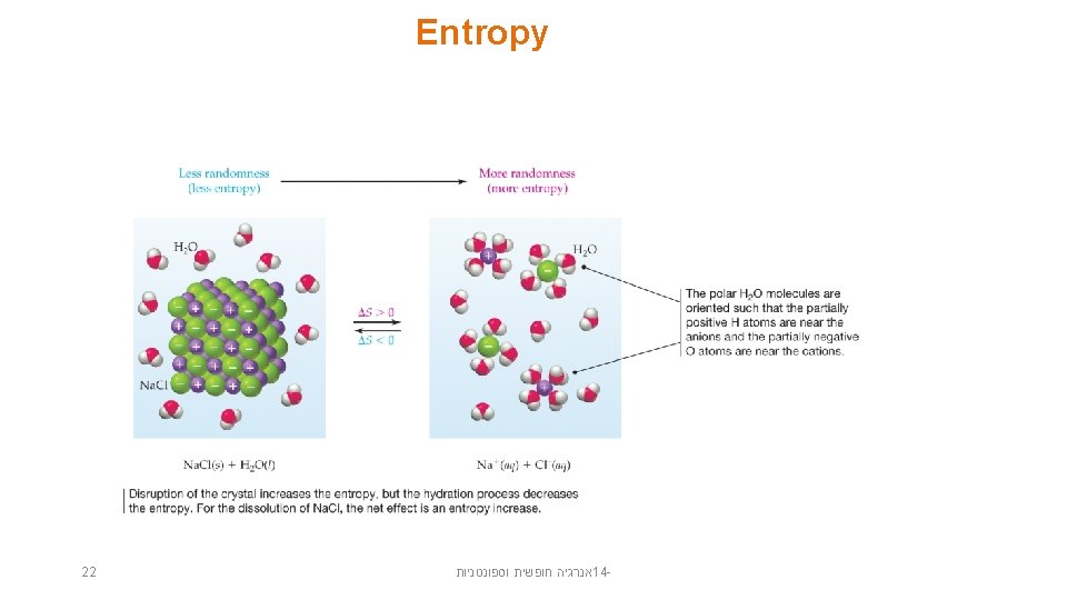 Predicting Entropy Changes Predict whether S will increase or decrease for: 2 CO(g) + O 2(g) → 2 CO 2(g) Decrease 3 gas molecules → 2 gas molecules. Na. Cl(s) → Na+(aq) + Cl-(aq) Increase Ions locked in a crystal → ions dispersed in water. H 2 O(ℓ) → H 2 O(s) Decrease Liquid molecules less restricted than solid molecules. אנרגיה חופשית וספונטניות 1434