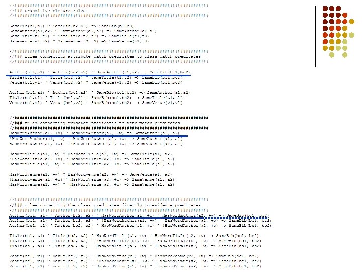 Entity Resolution Problem: Given database, find duplicate records Has. Token(token, field, record) Same. Field(field, record) Same. Record(record, record) TFIDFSim. Greater. Than 0. 8(+t, +f, r’) Has. Token(+t, +f, r) ^ Has. Token(+t, +f, r’) => Same. Field(f, r, r’) => Same. Record(r, r’) ^ Same. Record(r’, r”) => Same. Record(r, r”) TFIDFSim. Greater. Than 0. 6(+t, +f, r’) => Same. Field(f, r, r’) TFIDFSim. Greater. Than 0. 4(+t, +f, r’) => Same. Field(f, r, r’) Etc, etc
