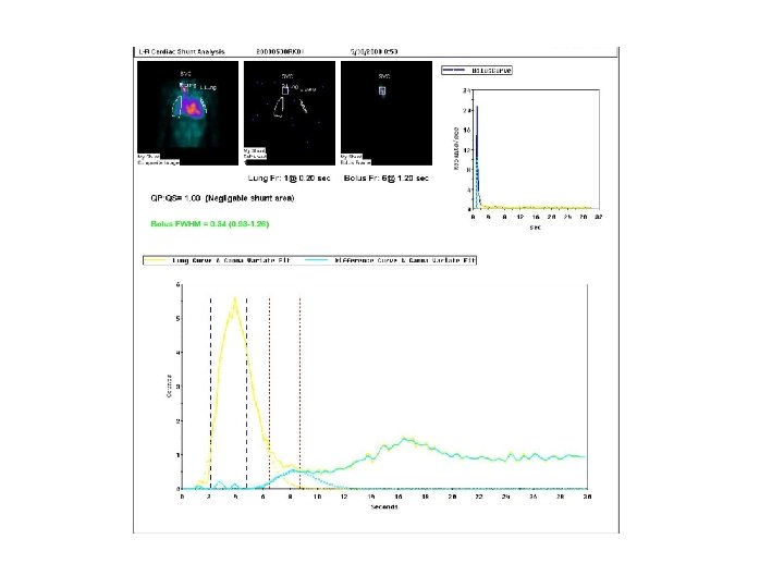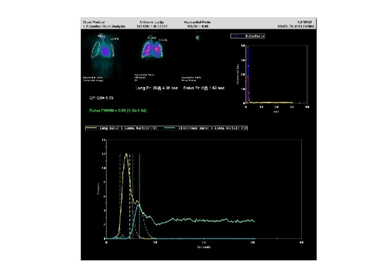 • diagnostic imaging method which uses intravenously injecticed radiopharmaceutical for dynamic scintigraphy of the first pass of radiopharmaceutical through the heart, lungs and blood vessels by gamma camera over the heart • analasys of sequantial scintigraphs and generating “time activity curve” allows for diagnosis of heart abnormalities with pathologic communication between heart chambers or between pulmonary artery and aorta, and for quantification of left-to-right and right-to-left shunts