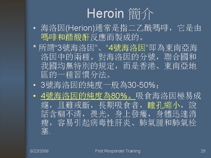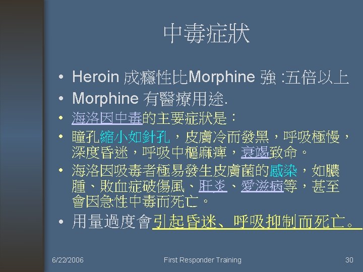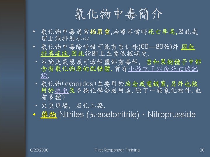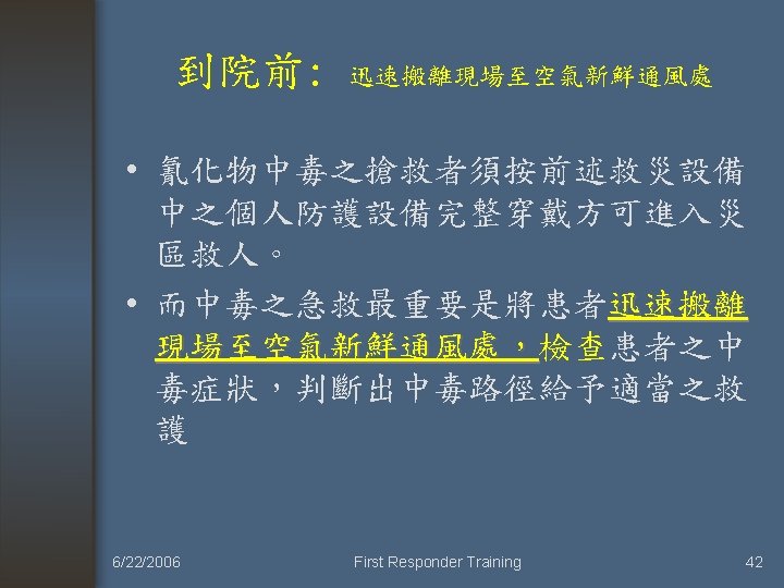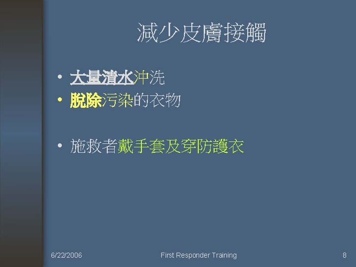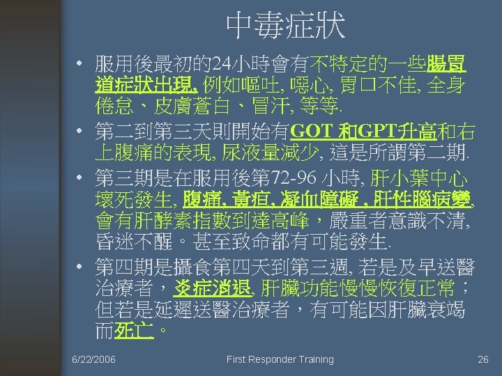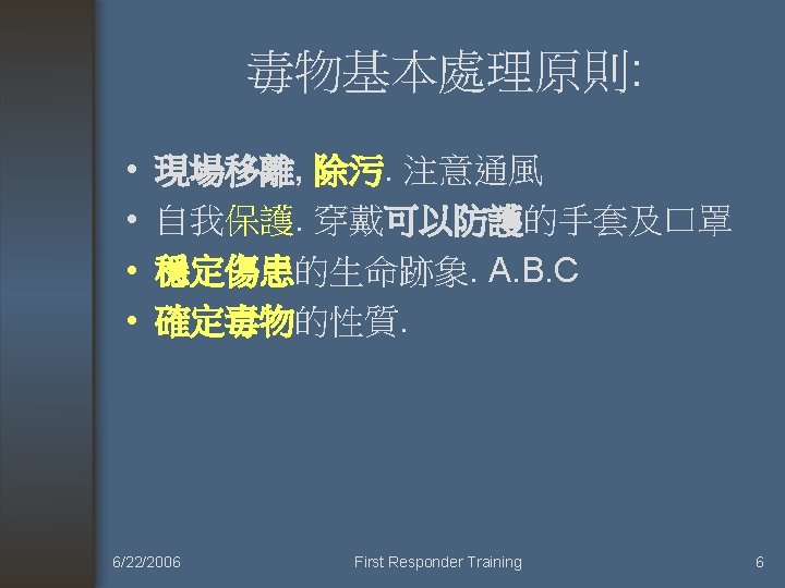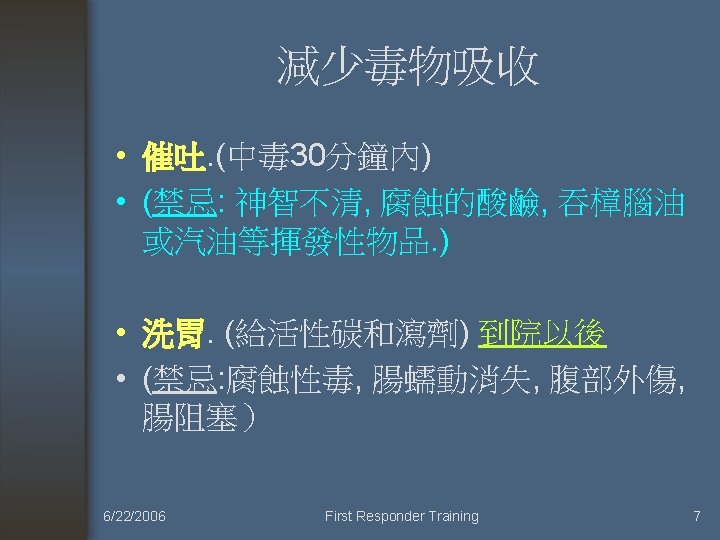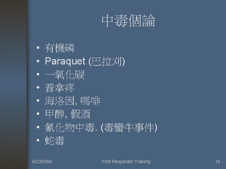 Activated Charcoal was of no use (不需使用活性炭來減少吸收) • • • (1) 腐蝕性物質(Corrosive) (2) 碳氫化合物 (3) 酒精 (4) 硼酸 (5) 氰化物 (6) 金屬離子。 6/22/2006 First Responder Training 9