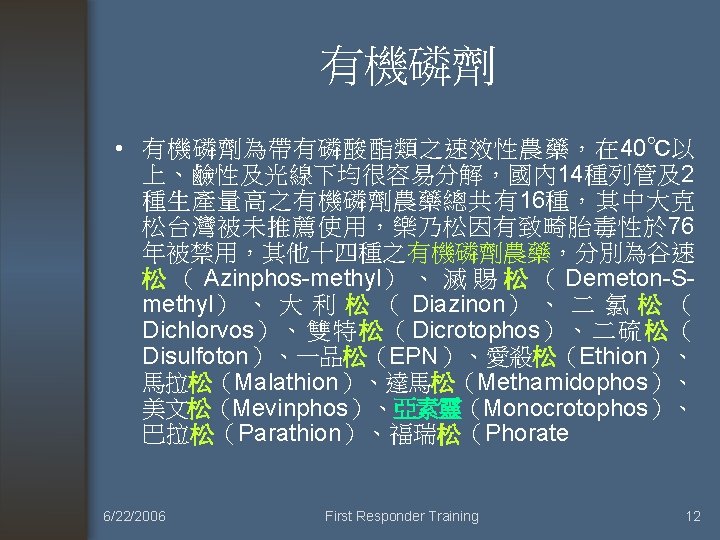 Organophosphate intoxication: 有機磷中毒 * 中毒症狀迅速出現: SOB, asthma,痰多, vomit, 腹絞痛,diarrhea. Stool incontinence. Sweating, tremor. 情緒不穩。 Respiratory paralysis. 瞳孔縮小。Pulmonary edema, coma, die. 肺水腫, 死亡. * TOXIDROME: 症狀SLUDGE, salivation, sweating, lacrimation, urinary incontinence, diarrhea, gastrointestinal distress, emesis. 6/22/2006 First Responder Training 11