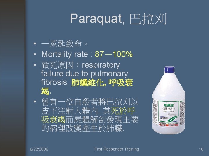 Paraquat 中毒 • 檢驗: 可以經由驗尿測知 • 口腔、食道灼傷、潰瘍。 • 經過 24~ 96 hrs, renal failure, liver damage. 肝、腎。 • 3 天 pulmonary fibrosis. 肺纖維化。 6/22/2006 First Responder Training 17