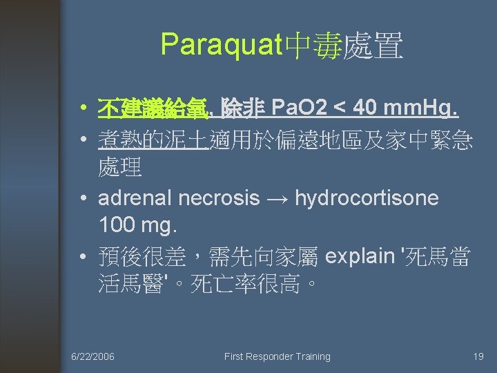 Paraquat中毒處置 • 洗胃,每 2~ 4 hr, 給一次 charcoal 50 gm. • Fuller's earth. 60 gm/BT • Bentonite 14 gm/2 pk. • Mg citrate. 250 m. L • N/S 250 ml + Lasix 20 mg q 4 h. • D-propranolol 競爭細胞膜 receptor. • hemoperfusion 2 times/day 每次 8 hr. 6/22/2006 First Responder Training 18