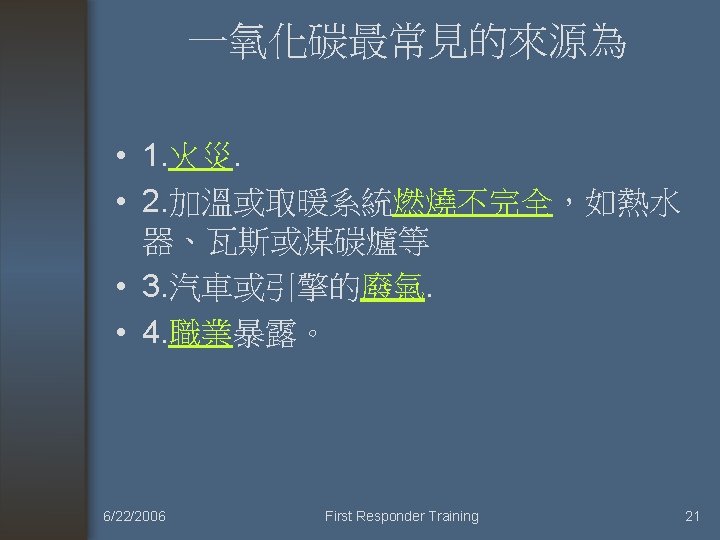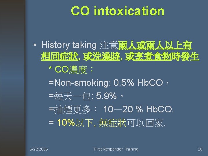 CO 中毒症狀: – – – – Malaise, flulike symptoms, fatigue Dyspnea on exertion, DOE. Chest pain, palpitations Lethargy, Confusion, Depression Impulsiveness Distractibility Hallucination, confabulation, Agitation Nausea, vomiting, diarrhea Abdominal pain Headache, drowsiness Dizziness, weakness, confusion Visual disturbance, syncope, seizure Fecal and urinary incontinence Memory and gait disturbances Bizarre neurologic symptoms, coma 6/22/2006 First Responder Training 22